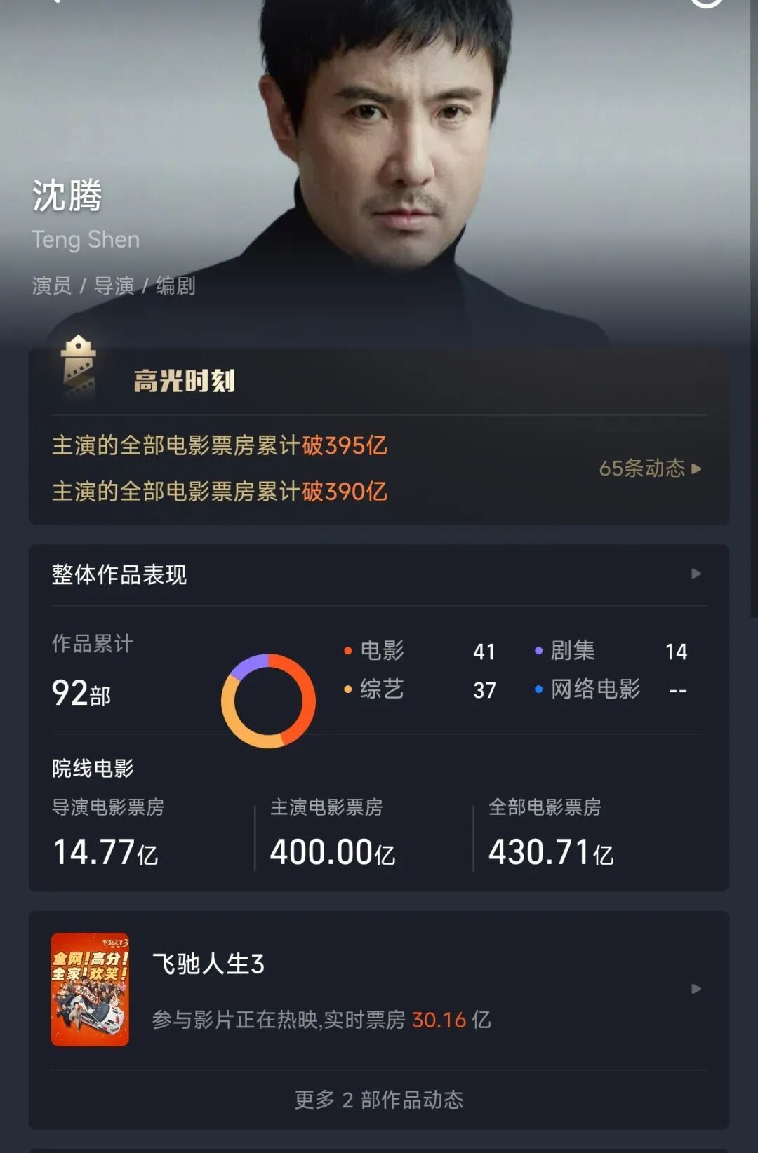 据潇湘晨报消息,灯塔专业版数据显示,截至2026年2月24日14:38,沈腾主演电影共25部,总票房超过400亿元,成为首位主演电影票房破400亿元的演员。今年大年初一由沈腾主演的电影《飞驰人生3》,上映八天就收获了30.16亿元票房,领跑春节档。