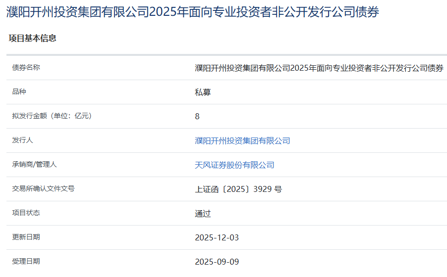 【大河财立方消息】12月3日,濮阳开州投资集团有限公司2025年面向专业投资者非公开发行公司债券获上交所通过。该债券拟发行金额8亿元,承销商/管理人为天风证券(601162)。2025年6月30日,经中证鹏元综合评定,发行人主体信用评级为AA,评级展望稳定。