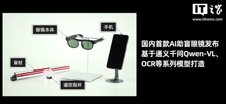 IT之家 12 月 3 日消息,据阿里云消息,今日杭州瞳行科技公司正式发布国内首款 AI 助盲眼镜。该眼镜基于通义千问 Qwen-VL、OCR 等系列模型,具有出行避障、找物读物、语音助手和一键求助亲友等功能。该眼镜由眼镜主体、手机、遥控指环、盲杖四部分组成,目前已正式面市。
